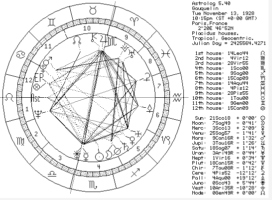 Michel Gauquelin and The Mars Effect Michel Gauquelin (1928-1991), a French scientist, set out to discover how much truth, if any, there really was in astrology. Assisted by his wife at the time, Francoise, he made some quite startling discoveries. He found little or no evidence of the zodiac signs being of importance, especially between family members. He found that very few people showed the typical traits associated with their sun sign and rather that they lacked in them. This could be explained by influences of other planets moderating them though. Through Gauquelin's research some long held beliefs, both astrologically and scientifically were challenged. Neither the astrologers nor the scientists were very happy, but for different reasons. Most notably, he discovered the "Mars Effect". The "Mars Effect" was derived from a study and analysis of more than 2000 eminent athlete's births. The findings were that there were a significantly higher number than chance would allow of those people having Mars either just risen (in the 12th or 11th house) or culminating (near the MC/Midheaven 8th-10th house). During the years after his findings were made public, his work was subjected to various tests by scientists, using other data samples, all of which went some way to proving that what he had discovered had validity. Yet, despite these tests showing the same incidence as Gauquelin had himself found he was ridiculed for it and many arguments ensued. It is said that some of the tests were deliberately manipulated to show that science was right and astrology wrong. Such was the controversy that after many years of it, Gauquelin took his own life in 1991, having previously destroyed his magnificent work and original data. The "Mars Effect" was not the only thing that Gauquelin researched. He also found correlation between other groups of professions and the rising and culmination of the planets. There were also higher numbers than expected found to be on or close to the other two angles of the descendant and the IC, but without a doubt the most significant was the ascendant (having risen and therefore 12th house) followed by the MC (having culminated and therefore 9th house). Out of the ten planets, only half have any significance. They are the Moon, Venus, Mars, Jupiter and Saturn. None of the other planets worked out in such a way. However, only the Sun and Mercury are missing from that list of the traditional seven planets. The outer planets of Uranus, Neptune and Pluto are already known to be generational planets and their effect is of such too, so it would be unlikely that they would play any part. Mercury by its nature and by the fact that it is always close to the sun is also not hard to understand as not being a part of it. What of the sun then? The sun is representative of the ego, the individual, the core essence, so maybe by what it symbolises it could go some way to explain why it does not figure as the other planets do. In some professions it was noted that there was a distinct lack of strength for some of the planets. The results of Gauquelin's investigations show the following professions to correlate with the planets being prominent by virtue of being close to the angles as follows: Sportsmen - Mars, lack of Moon Military - Mars or Jupiter Actors - Jupiter Doctors - Mars or Saturn, lack of Jupiter Politicians - Moon or Jupiter Executives - Mars or Jupiter Scientists - Mars or Saturn, lack of Jup iter Writers - Moon, lack of Mars or Saturn Journalists - Jupiter, lack of Saturn Playwrights - Jupiter Painters - Venus, lack of Mars or Saturn Musicians - Venus, lack of Mars Gauquelin also studied the birthcharts of families and found that where a parent has a planet on an angle in their own birthchart, likewise a child will often also have the same planet on the same angle in theirs. However, he disputed that parents and children often share the same signs of their planetary placements. Through my own, albeit limited, research into family relationships, I disagree with that. I have found that in compiling an astrological family tree there are many similarities between the charts that pass down the generations. More on this subject can be found on the Family page. The birthchart of Michel Gauquelin is at the end of this page.